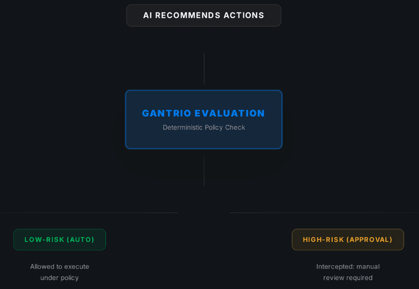 Manual review cannot scale to the speed of AI. Gantrio enables autonomous execution at machine speed while maintaining human-in-the-loop control for risk.
